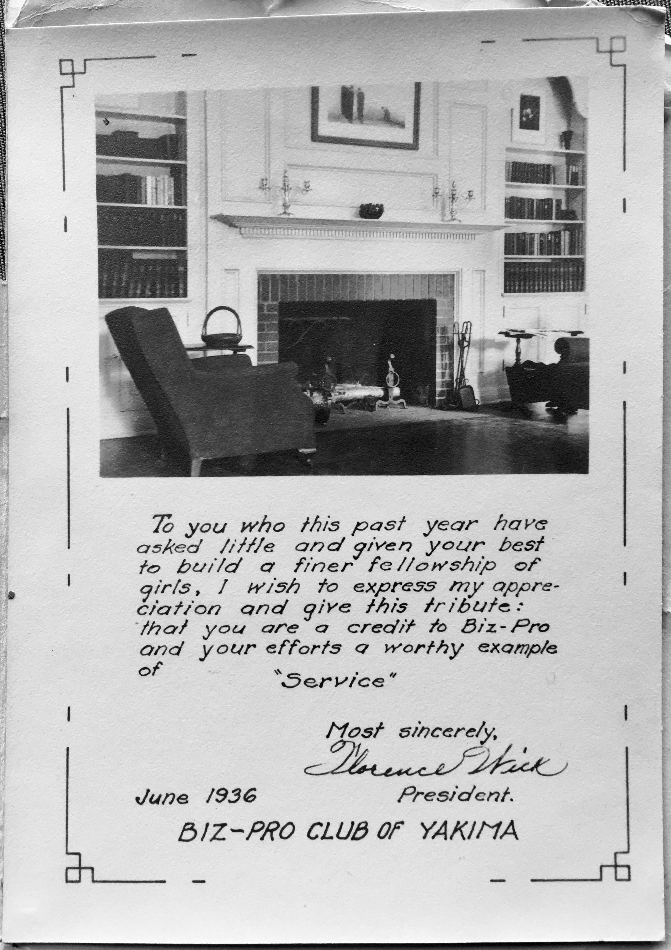 Flo was Biz-Pro president in 1936While she could never afford college, she did join a sorority, Epsilon Sigma Alpha, which had been reorganized from a college group to include businesswomen. She was also a member and president of the Business and Professional Women’s Club (Biz-Pro) one of the “business girls” clubs that fell under the umbrella of the YWCA. These linked organizations provided opportunities for what we now call networking, but they also promoted the rights and welfare of workingwomen by sponsoring legislation for equal pay and to prohibit legislation denying jobs to married women. Founded to address the surge of women into the workforce during WWI, Biz-Pro still continues to advocate for workingwomen promoting equal pay, comparable worth and family leave legislation.