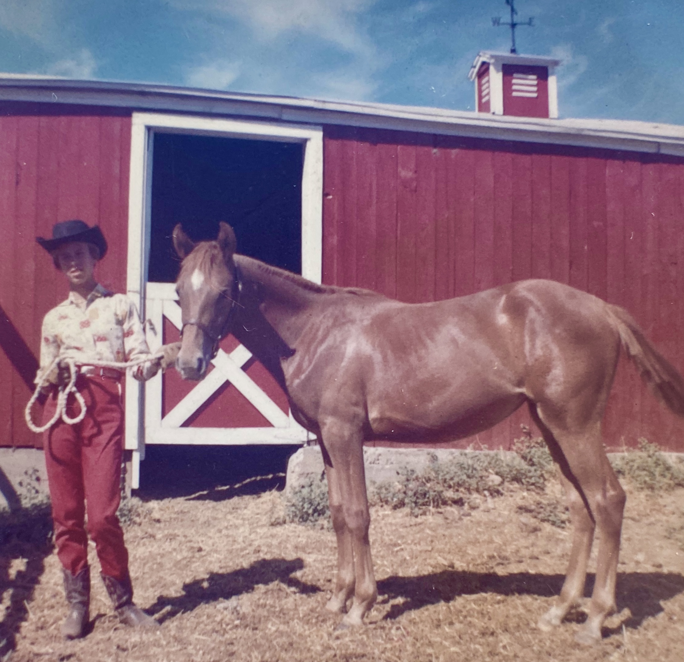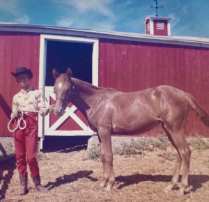 Barbie survived and grew into a mare with excellent conformation. We knew that her mother had been a registered Quarter Horse. Barbie was small, only 14-2 hands high, easily mounted bareback by my 12-year-old self. I took charge of Barbie’s training, teaching her to lead, setting the saddle on her back and riding her for the first time. We trained in the small pasture, repeating figure eights and practicing changing leads. I showed her in 4-H shows and fairs.