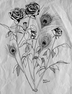 My brother Don, the poultryman, raised many different breeds of chickens and exotic poultry including peafowl (the males are peacocks, the females peahens). Neighborhood dogs would form packs and could take down a calf or a goat. When one of our dogs misbehaved he was immediately put down, even as my brothers protested. One night a pack dug into the peafowl pen and killed all its residents. We buried them in the rose garden. Afterward my mother dreamed that the roses bloomed as peacock feathers. She wrote the story. I penned the illustration. Don couldn’t remember if we ever ate peafowl, but he did research the prospect and learned that it’s quite common in India.