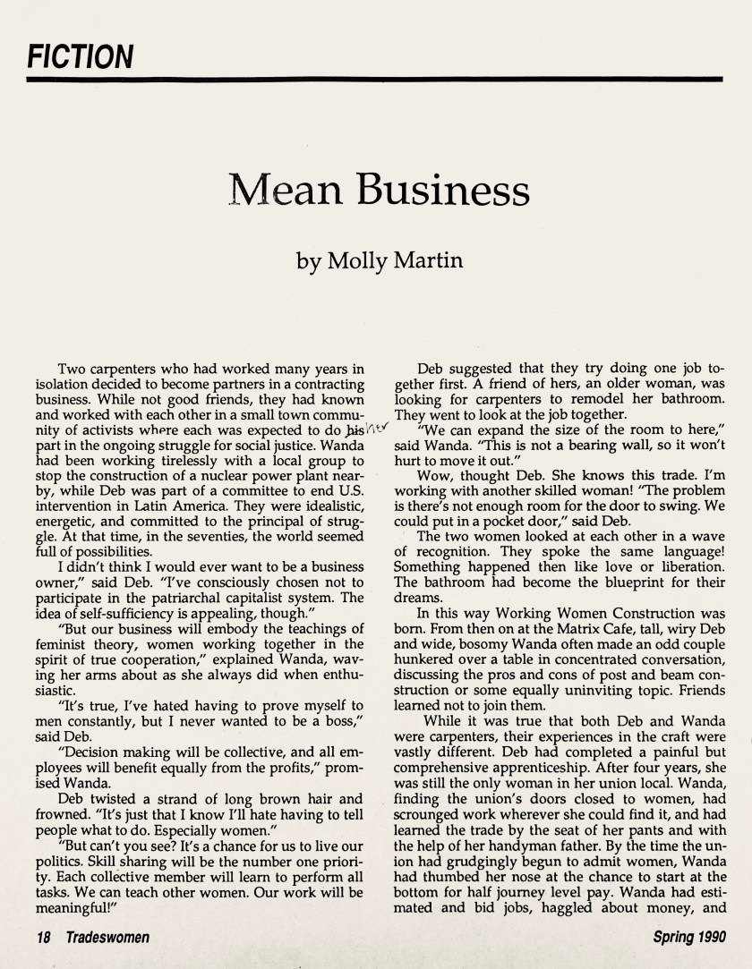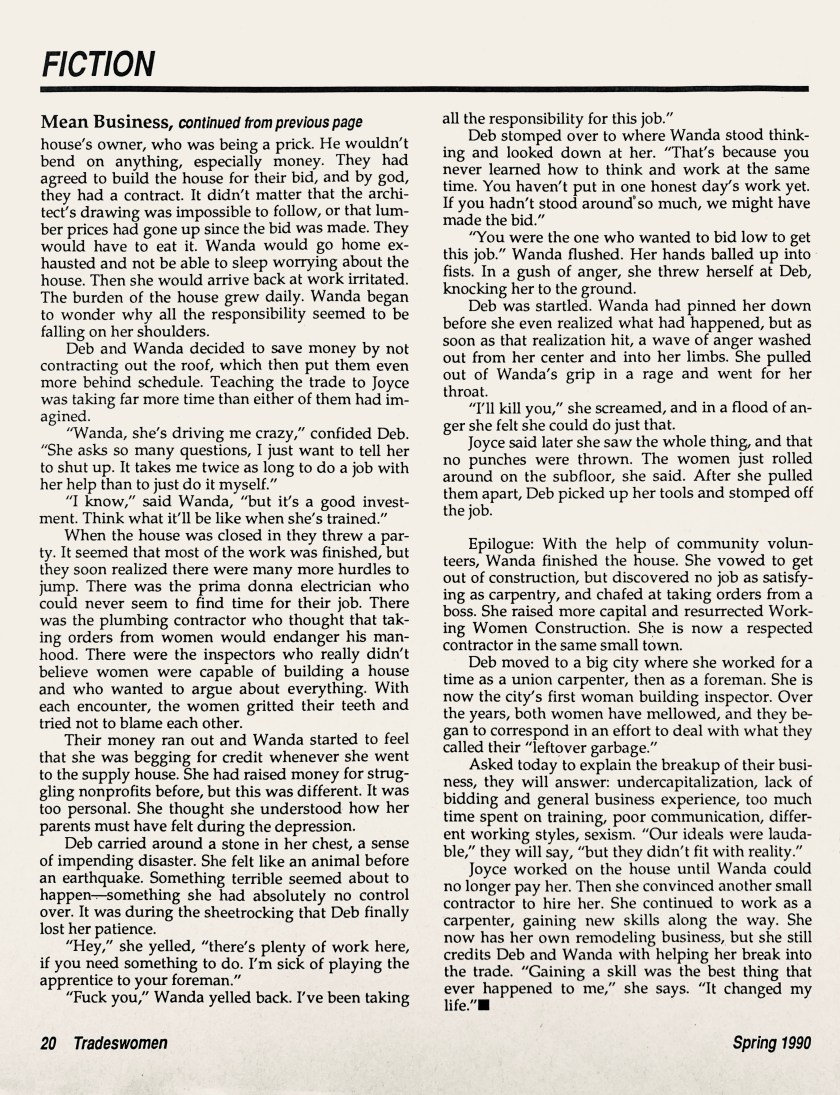 Many a tradeswoman dreams of dumping the bosses off her back and starting her own business. In the 1970s I was a partner in two small electrical contracting businesses, one–Wonder Woman Electric–all women. While the prospect seems idyllic, running a business is fraught with its own problems. I was glad to have done it and also relieved to go back to taking orders from a foreman. Contracting drove me crazy but I’m proud that we succeeded in training female electricians who made great careers in the trades. Here’s a story published in Tradeswomen Magazine set in that time when everything seemed possible.