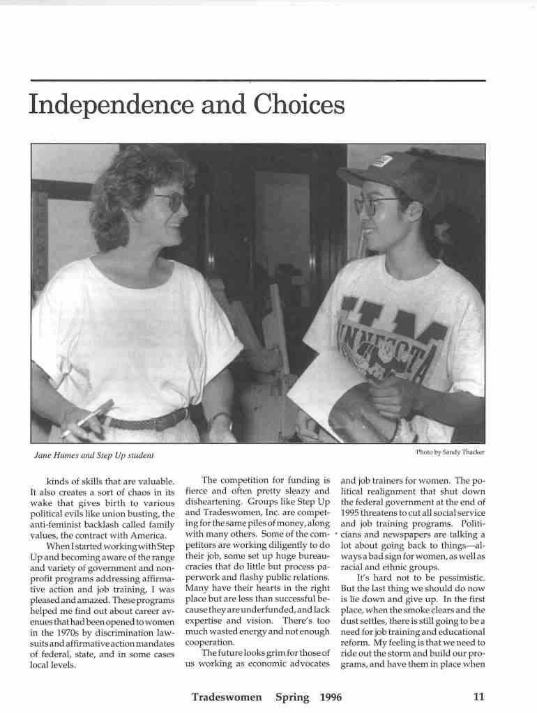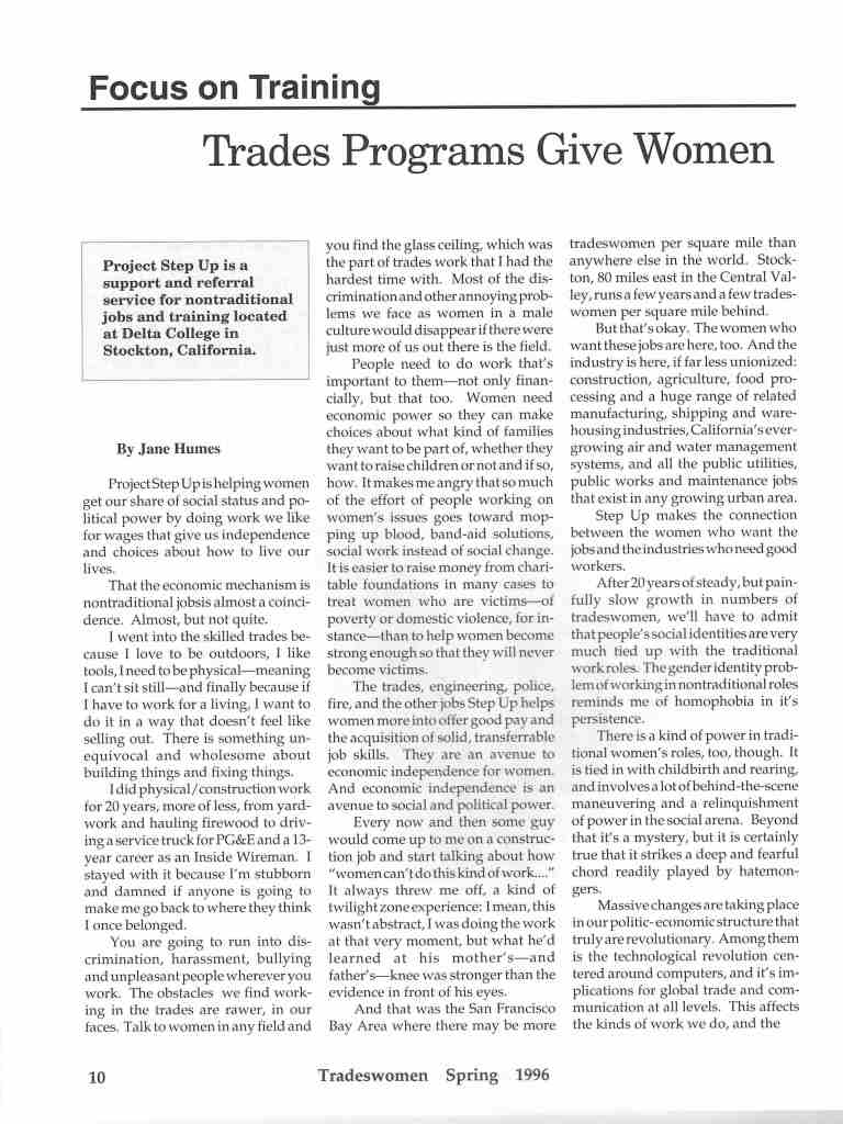 Jane was a fine writer and penned many articles for Tradeswomen Magazine and she served on the board of Tradeswomen Inc.