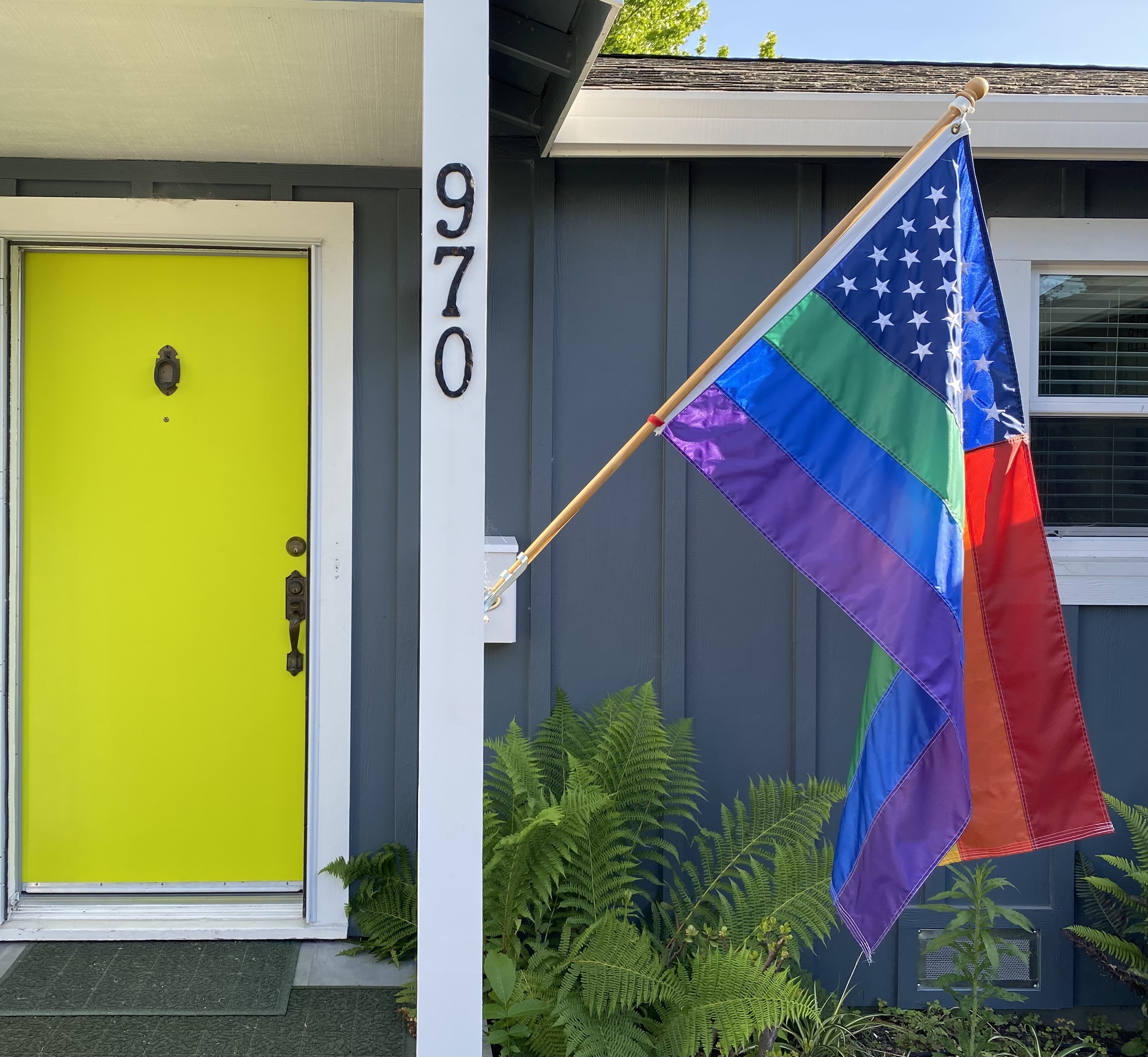 Flags are big during Gay Month. We hung the gay flag on June 1, a ritual repeated every year.