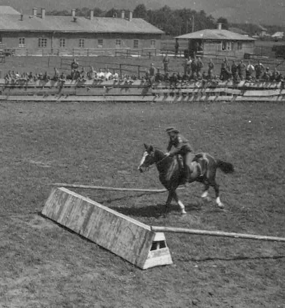 Clubmobiler Janet Potts, already an experienced equestrian with competition miles behind her, took part in the show. Even so, jumping with an unfamiliar horse must have been a challenge. And the horses themselves raise questions: where did they come from? Were they seized from a high-ranking Nazi officer? Whatever their origin, they were striking animals—well trained, elegant, and responsive. One photo even seems to show an American soldier riding a dressage horse, completing the unlikely tableau of a rodeo in postwar Salzburg.