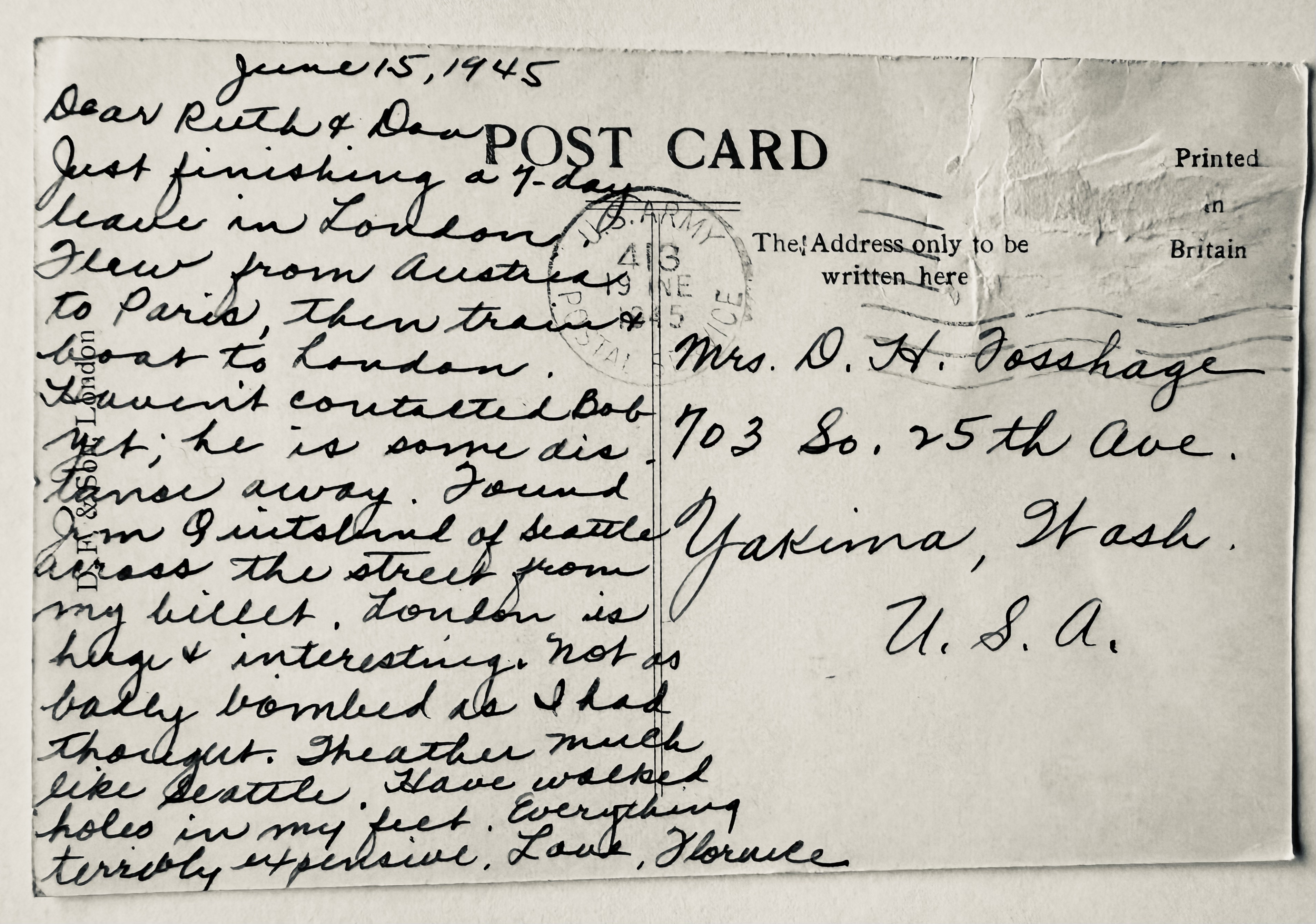 Flo arrived in London in June, 1945 for a seven-day leave. In a postcard to her family Flo wrote: