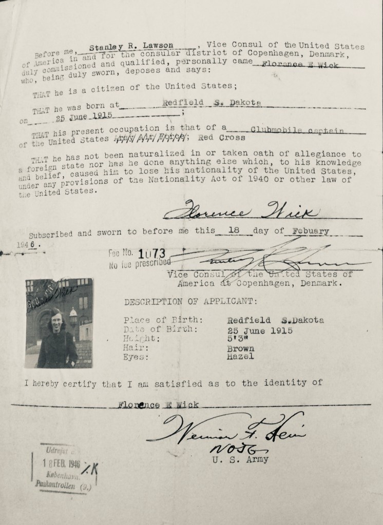 Flo stopped in Copenhagen on her way to visit relatives in Sweden. In a postcard home Flo wrote, “Copenhagen is a lovely city and the food is wonderful–milk, steaks, ice cream.” The city had escaped the ravages of war as few other European cities had.