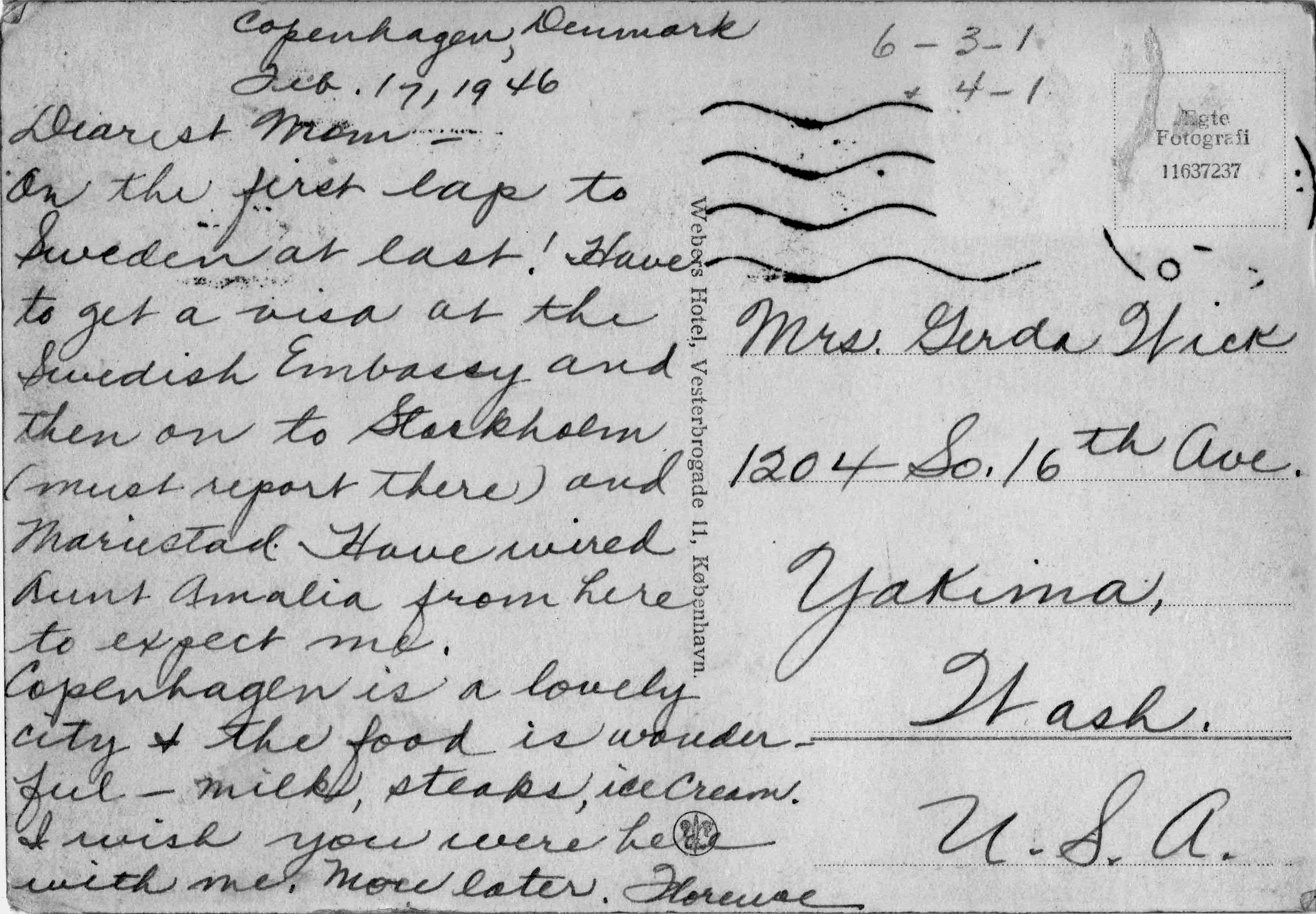 Flo stopped in Copenhagen on her way to visit relatives in Sweden. In a postcard home Flo wrote, “Copenhagen is a lovely city and the food is wonderful–milk, steaks, ice cream.” The city had escaped the ravages of war as few other European cities had.