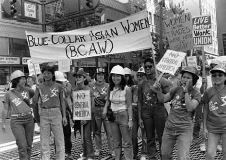 (Left to right) Stella Cheng, brick mason; Canyon Sam, electrician; Lucy Lim (behind Sam), power station operator; Lily Wu, plumber; Jane Watanabe, power station operator; Linda Jofuku, electrician; Joyce Fujiwara, tilesetter; Monica Bacanay, carpenter; Rosemary Cho-Leyson, carpenter and founder BCAW; Anne Leong, electrician. Labor rally, San Francisco, 1984.