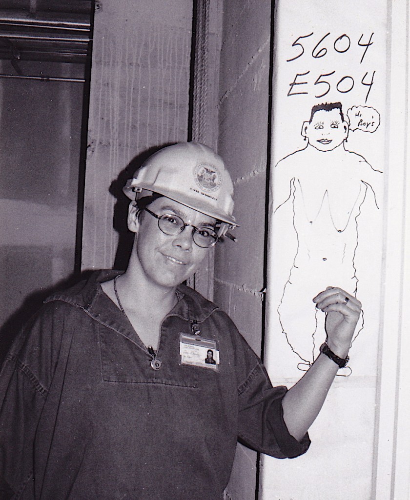 Previous Image Next Image grafitti_0001 Sister electrician Lyn Shimizu pointing out graffiti on the SF opera house job, 1997