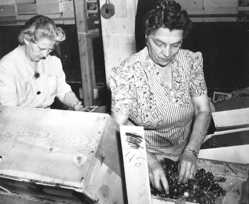 My grandmother, Gerda Wick (R), sorting cherries. Late 1930s?