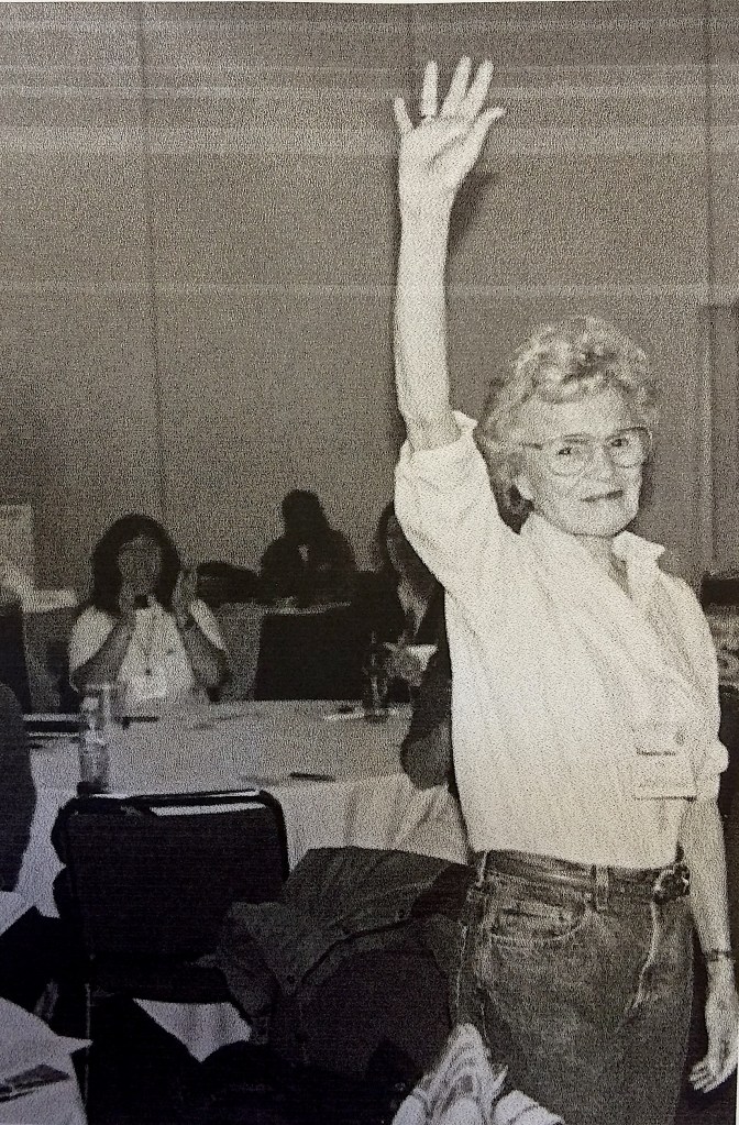 Previous Image Next Image Madeline conference Acknowledging her fans at a tradeswomen conference, 1980s