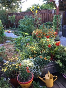 Sitting out in our yard on a lovely evening at the ides of August, Holly and I luxuriated in the garden’s summer radiance. The day was cooling as the sun retreated. Colorful zinneas and cone flowers bloomed and the fragrance of the rockrose bush enveloped us. Hummingbirds zipped back and forth. Finches and oak titmice populated the feeder. Towhees scratched the ground as mourning doves bobbed and cooed. It was a perfect summer evening.