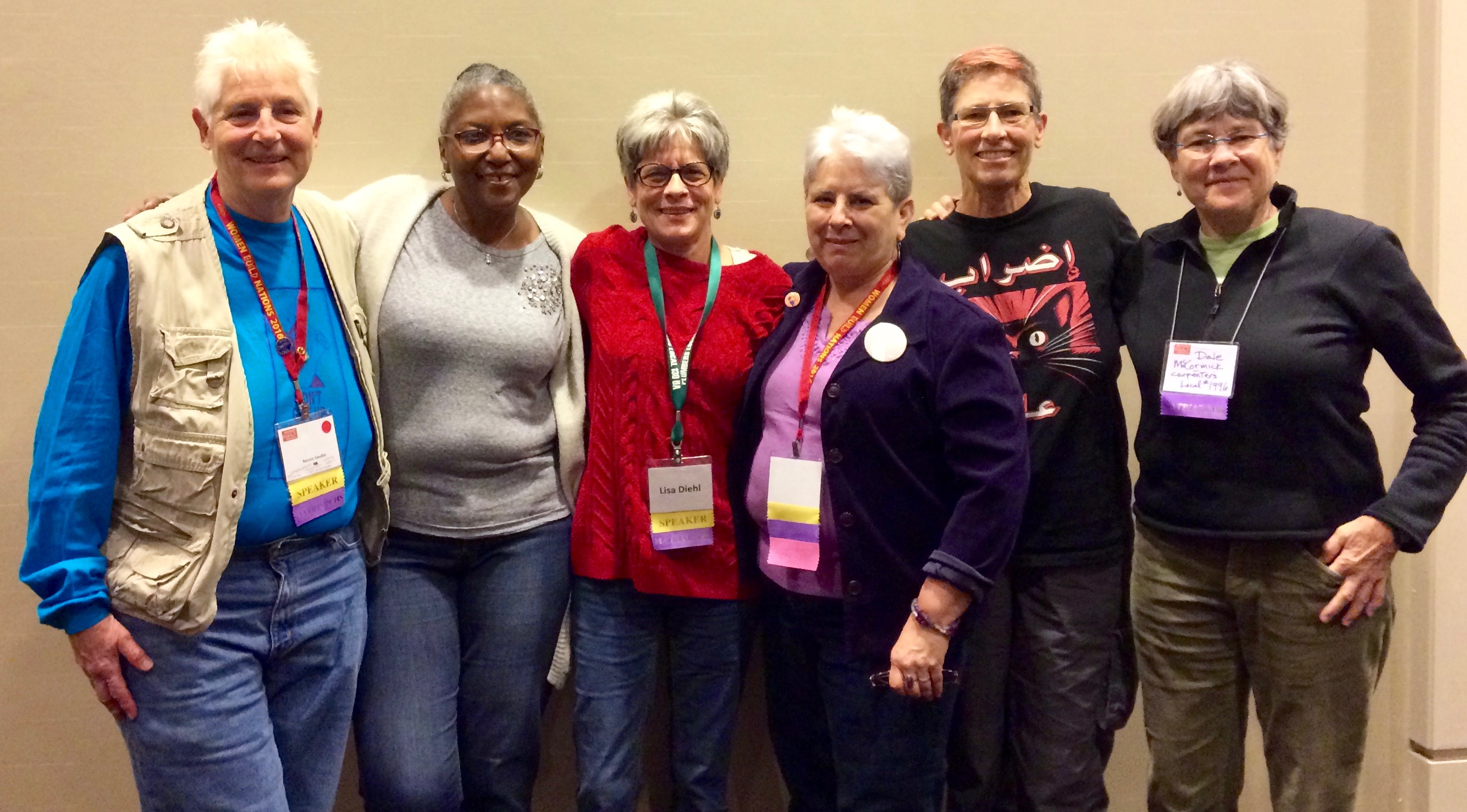 As it turned out we had a mini-reunion of some of us old tradeswomen activists from the 1970s and 80s. Carpenter Lisa Diehl, who’d been an organizer of Kansas City Tradeswomen, traveled from her home in West Virginia. She entertained us with stories of feminist actions from the radical 1970s. Ronnie Sandler, carpenter and job training wiz, came from New Hampshire. Dale McCormick, the first female in the country to turn out as a carpenter who went on to win a place in the Maine state legislature and become state treasurer, represented Maine. We reunited with Paula Smith and Lauren Sugerman, two organizers from Chicago we’d worked with to put on the 1989 second national tradeswomen conference there. And some of the early tradeswomen organizers from Chicago were in attendance too, sporting t-shirts and sweatshirts from the 1970s.