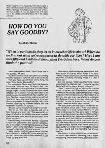 We returned to publishing the magazine as a quarterly in 1996. I bought a roll-top desk set up for a computer, assembled it in my bedroom and called it my International Publishing Empire. I edited each issue and laid it out in a computer program called PageMaker, whose workings I understood just enough to get by. Many folks helped in the magazine’s last years, but the most devoted was Bob Jolly, a retired English teacher whose daughter had been a tradeswoman. Finally, in the 1998-99 winter issue, I wrote of my intention to pass on the job to another volunteer editor. No one applied for the job, and that became the final issue.